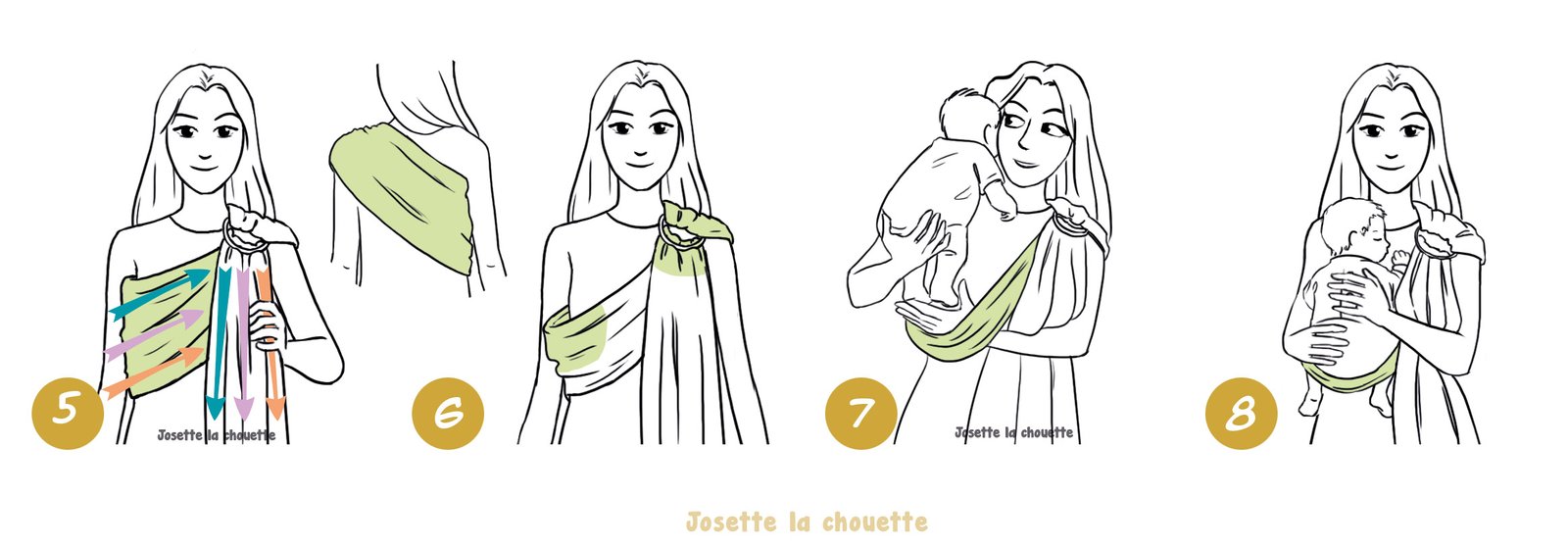 Lorsque vous avez préparé le tissu dans les anneaux, il n’est plus nécessaire de les défaire. Vous pouvez remettre votre sling, le passer à votre conjoint ainsi.