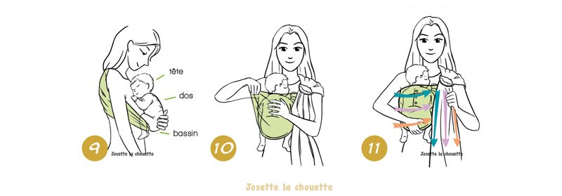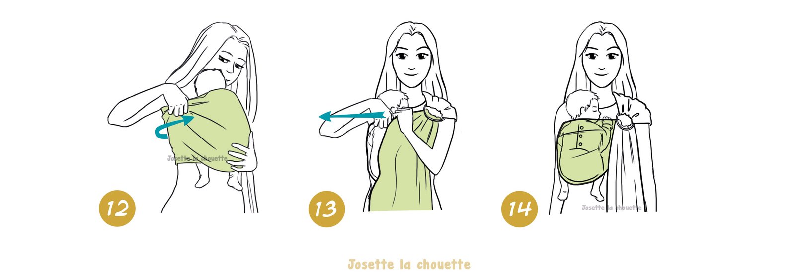 10 – Remontez doucement le tissu sans faire de pli jusqu’à bien couvrir la nuque. Ajustez le bassin de votre bébé comme dans un hamac.