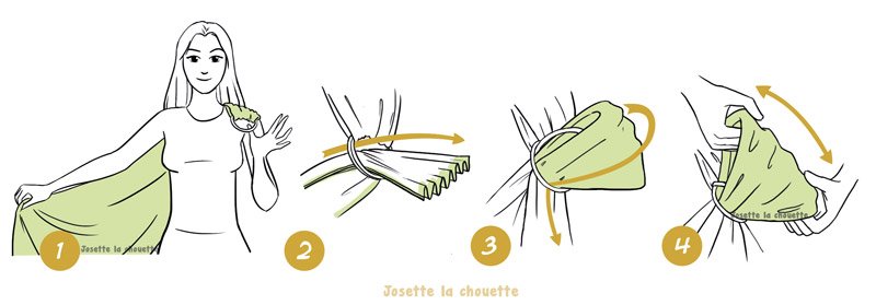 1 – Placez les anneaux sur votre épaule et attrapez le tissu de l’autre main. Le tissu est bien plat contre votre dos, sans vrille.
