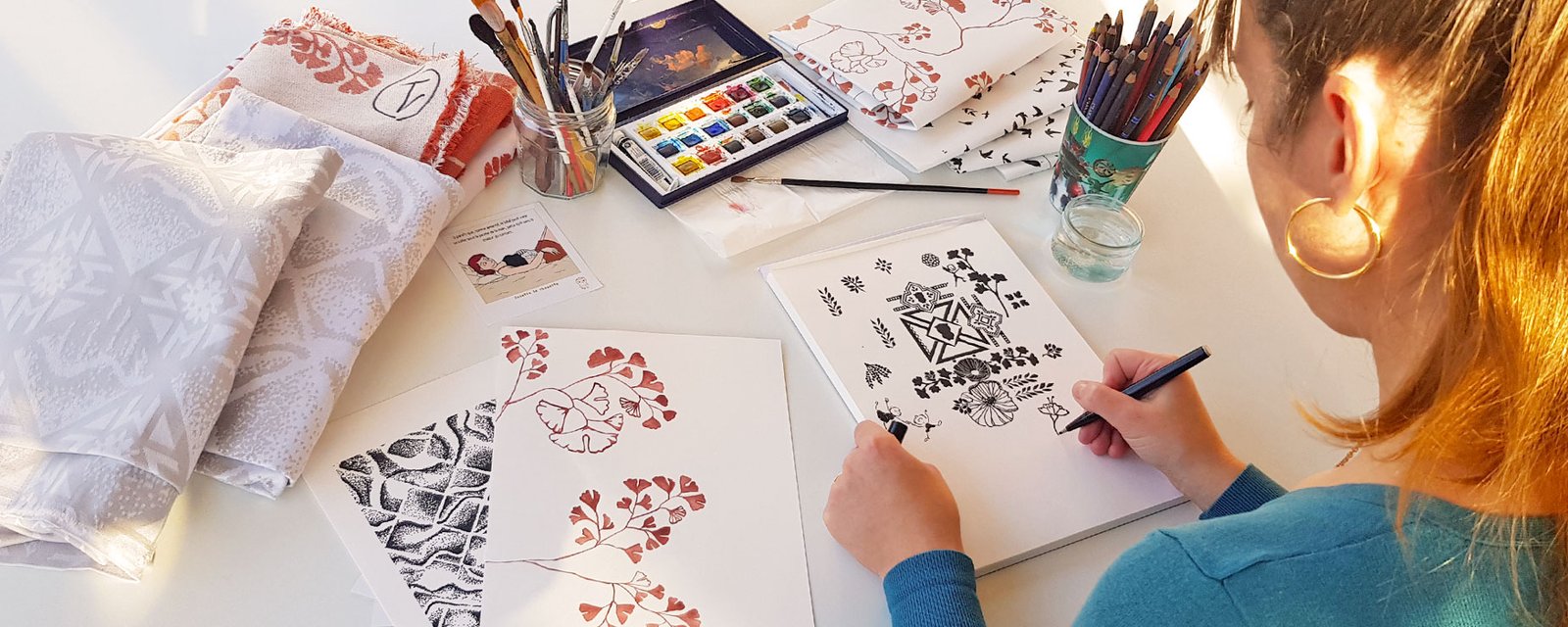 Je dessine les motifs des écharpes de portage, des slings et des porte-bébés.